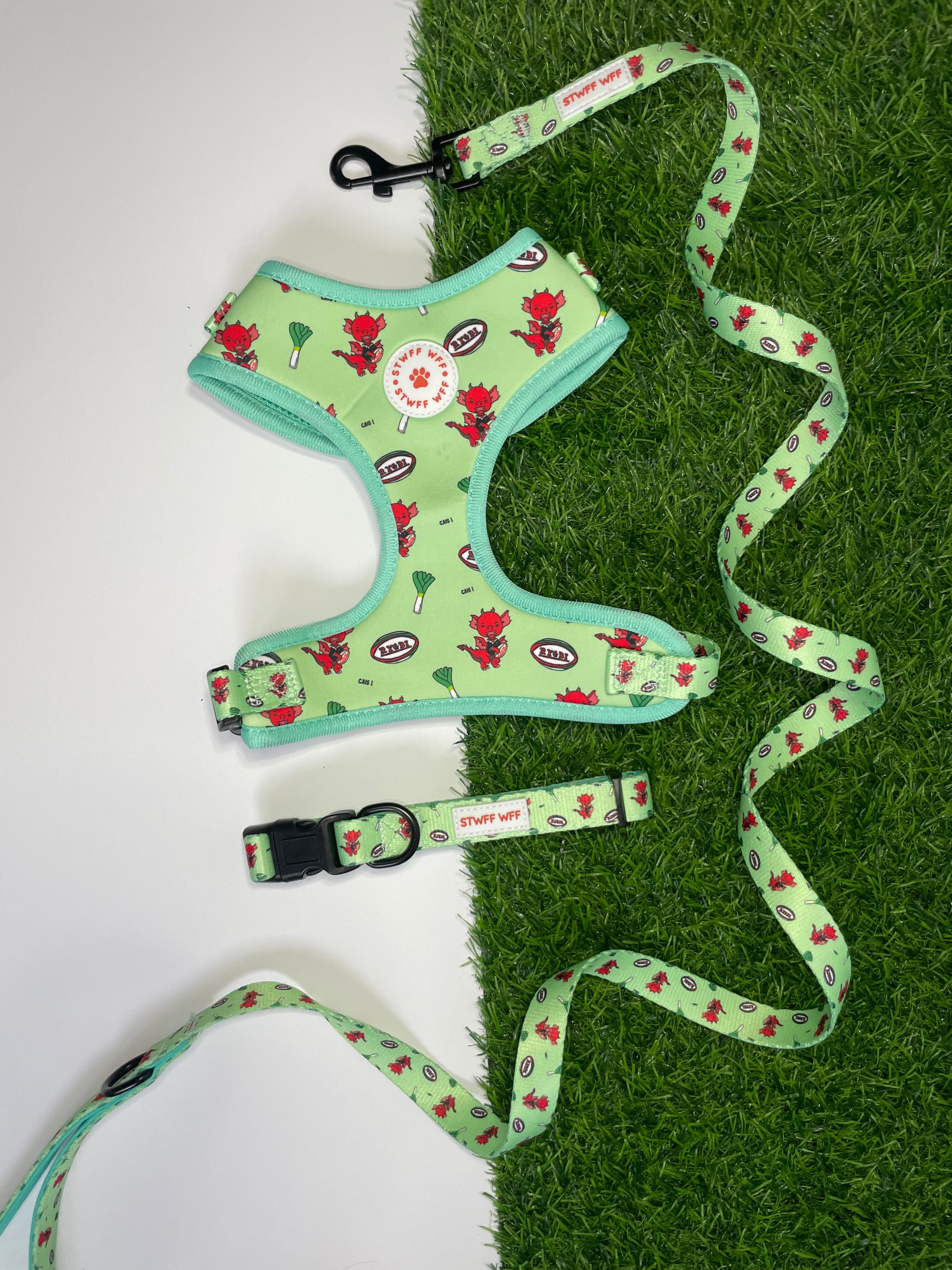 Set of 3 items which include a Harness, collar and lead with a red dragon, rugby ball and leeks on a light green background.
