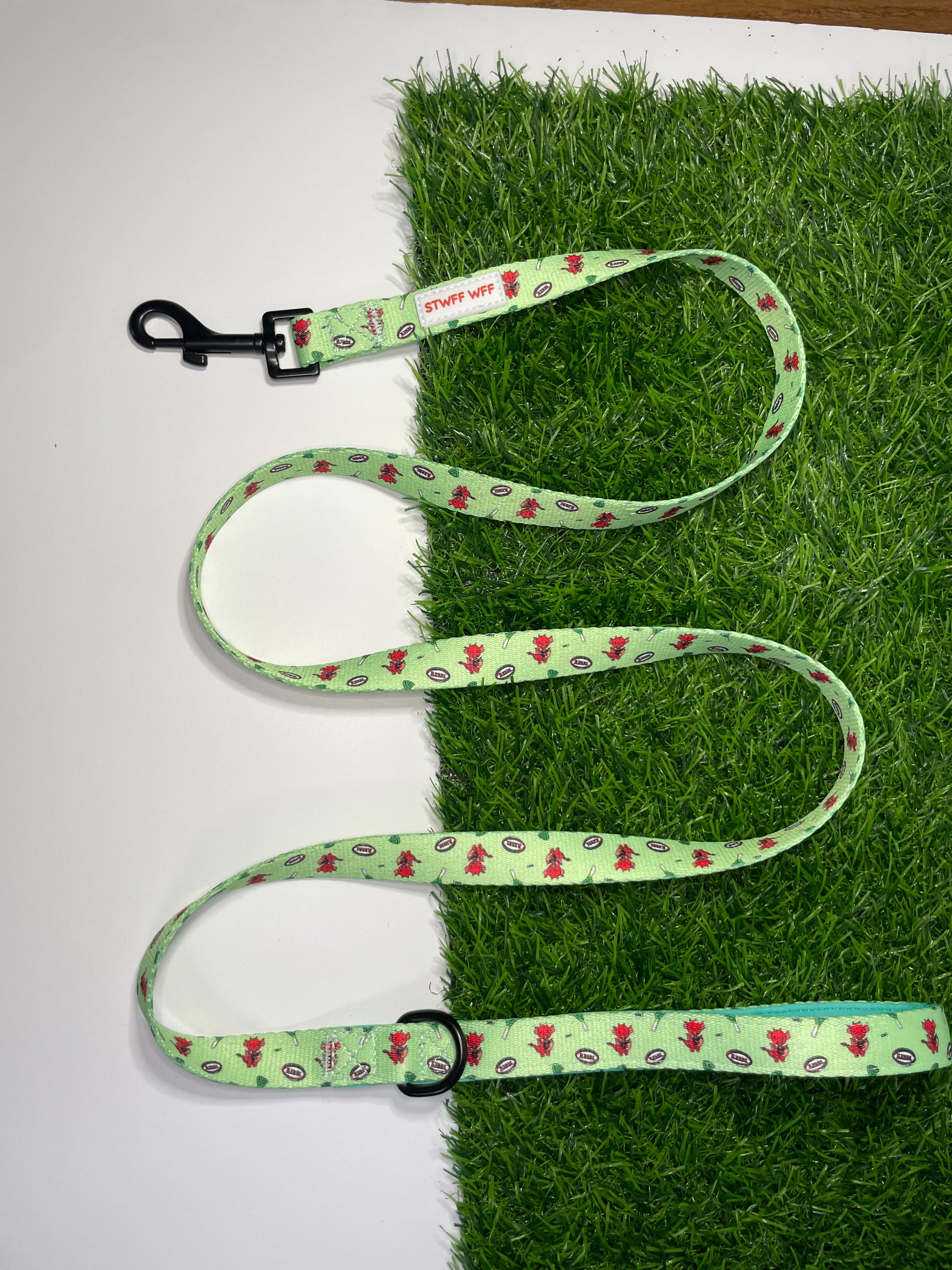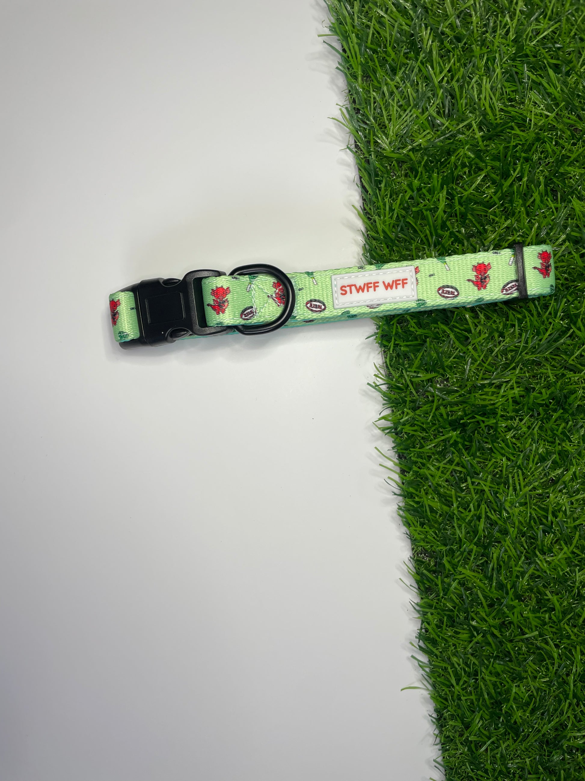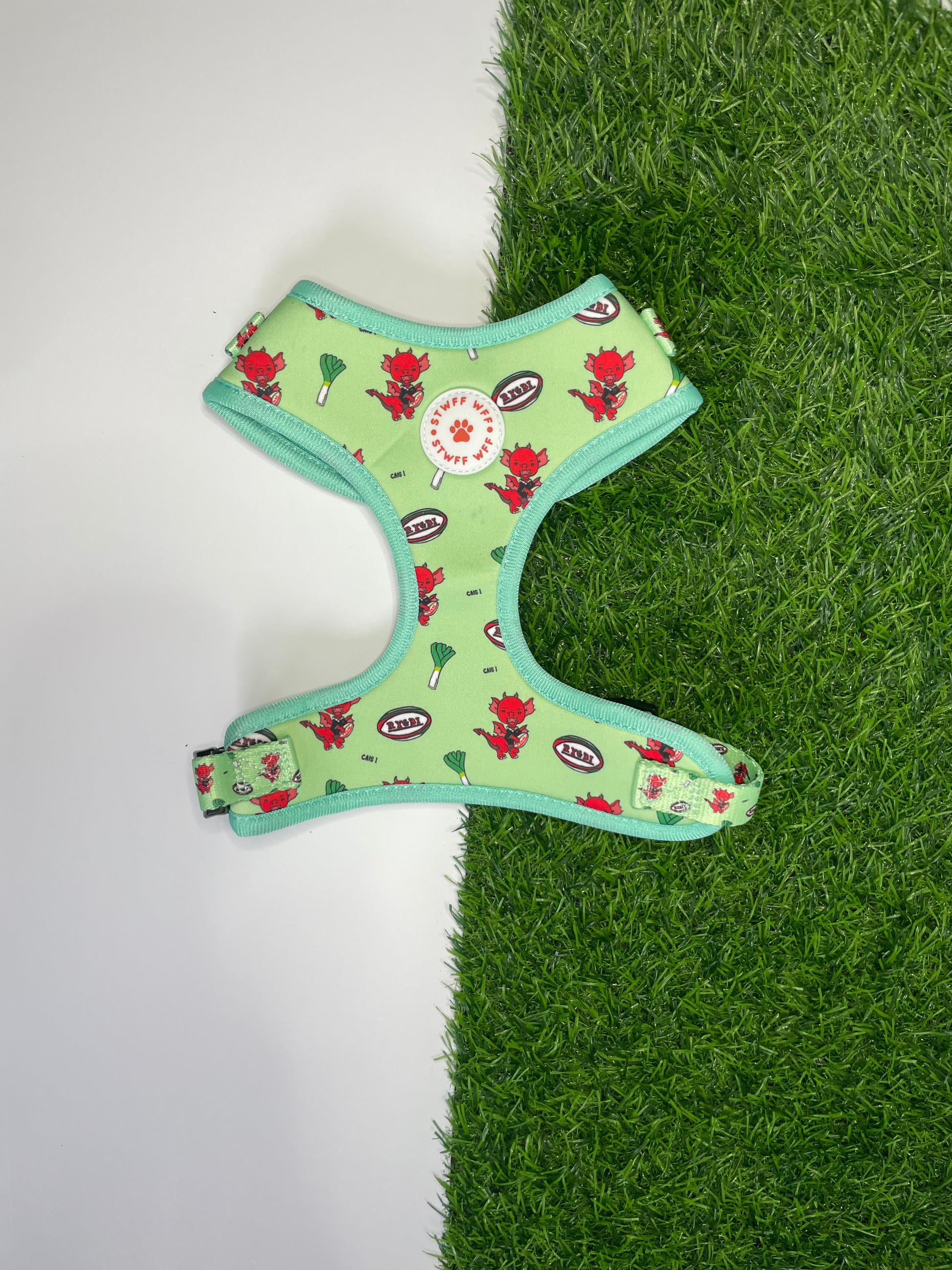 Set o 3 item sy'n cynnwys - Harnes, Coler ac tennyn hefo dyluniad rygbi, y ddraig goch ac cennin ar cefndir gwyrdd golau.