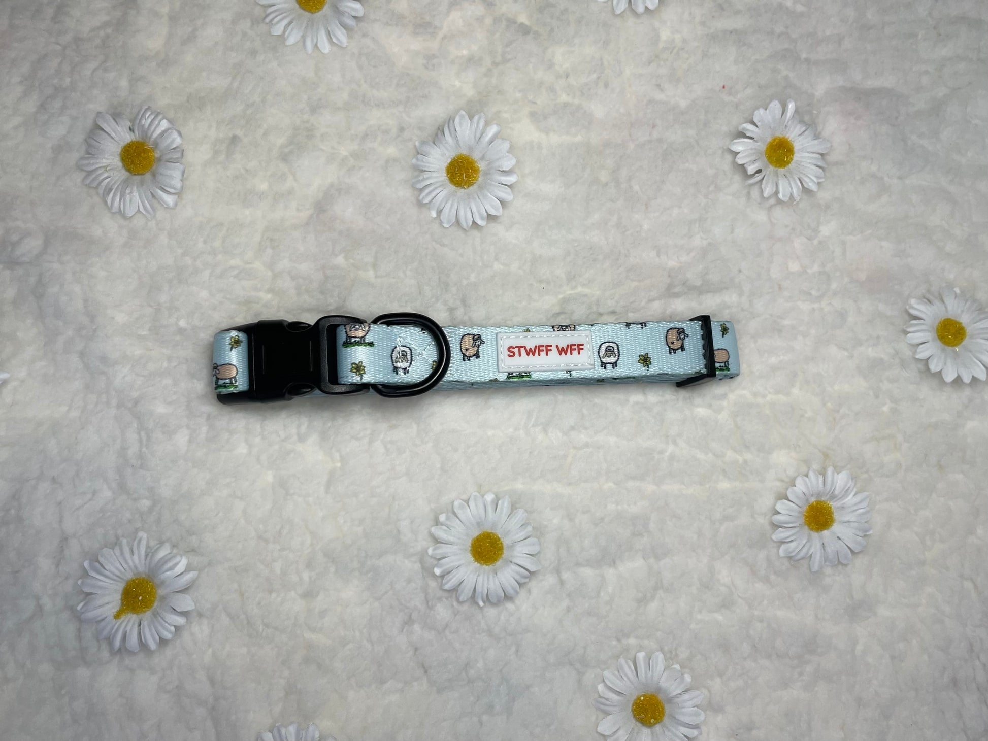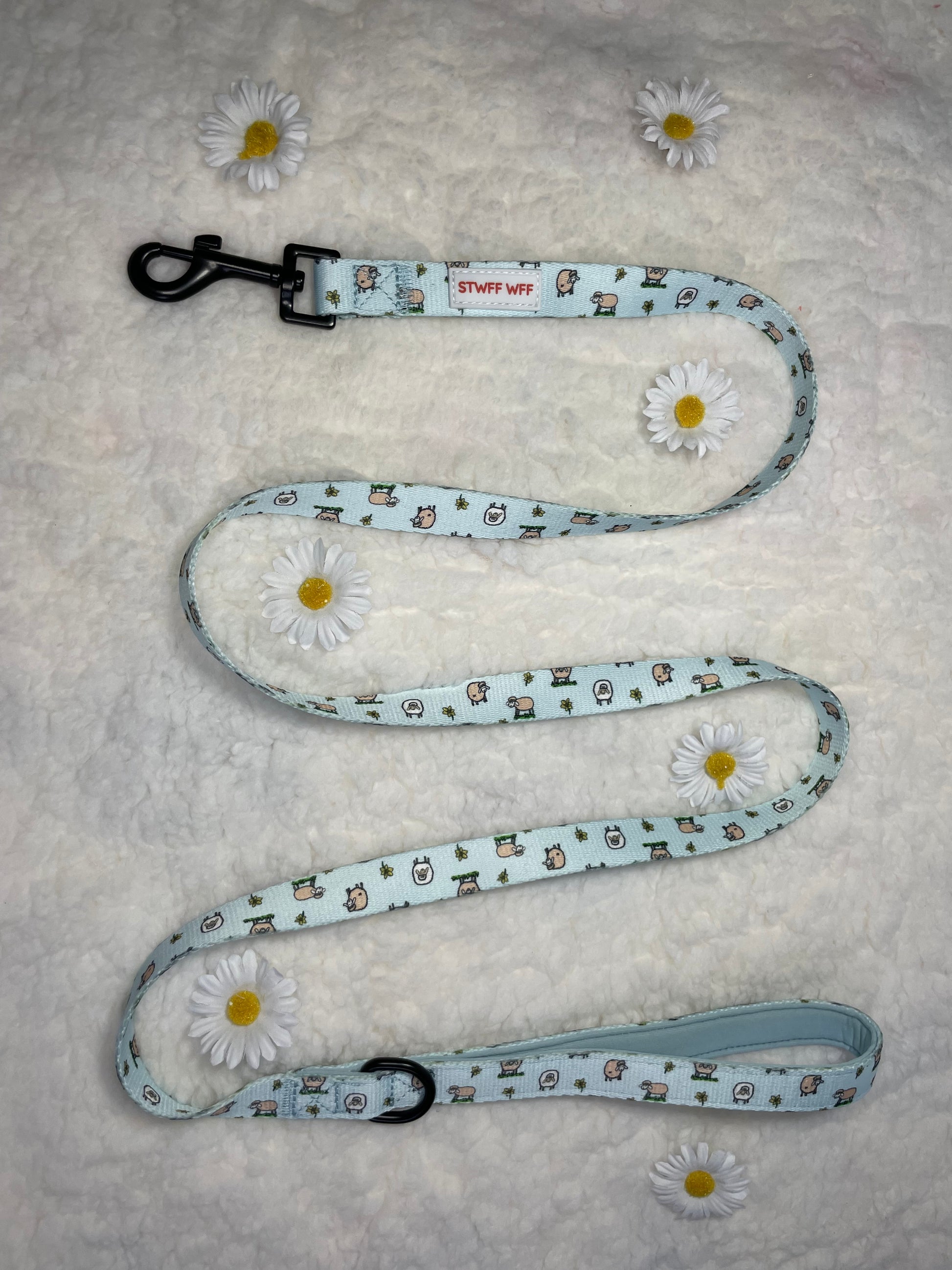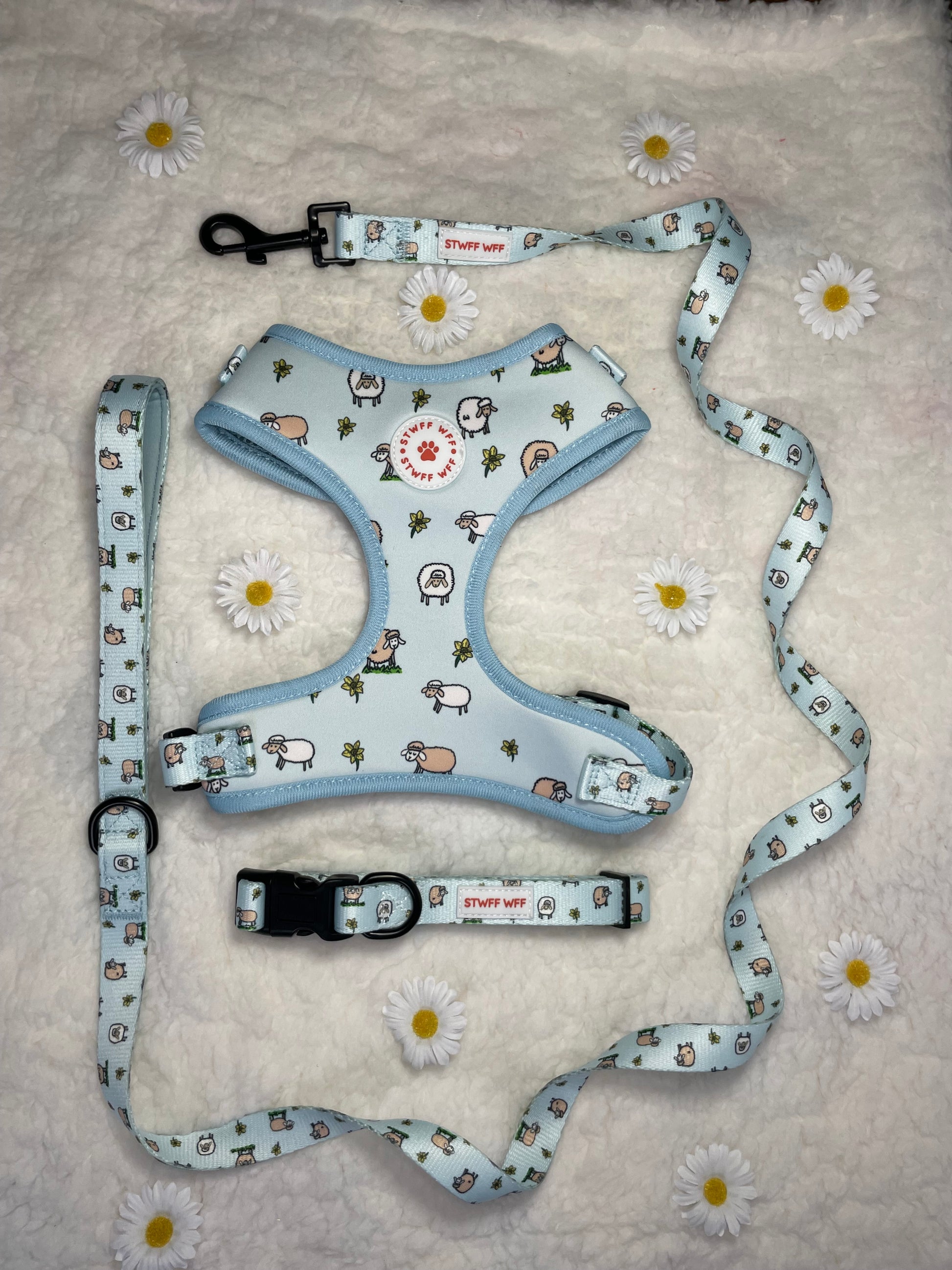 Set of 3 items which include a Harness, collar and lead with welsh sheep and daffodils on a light blue background.