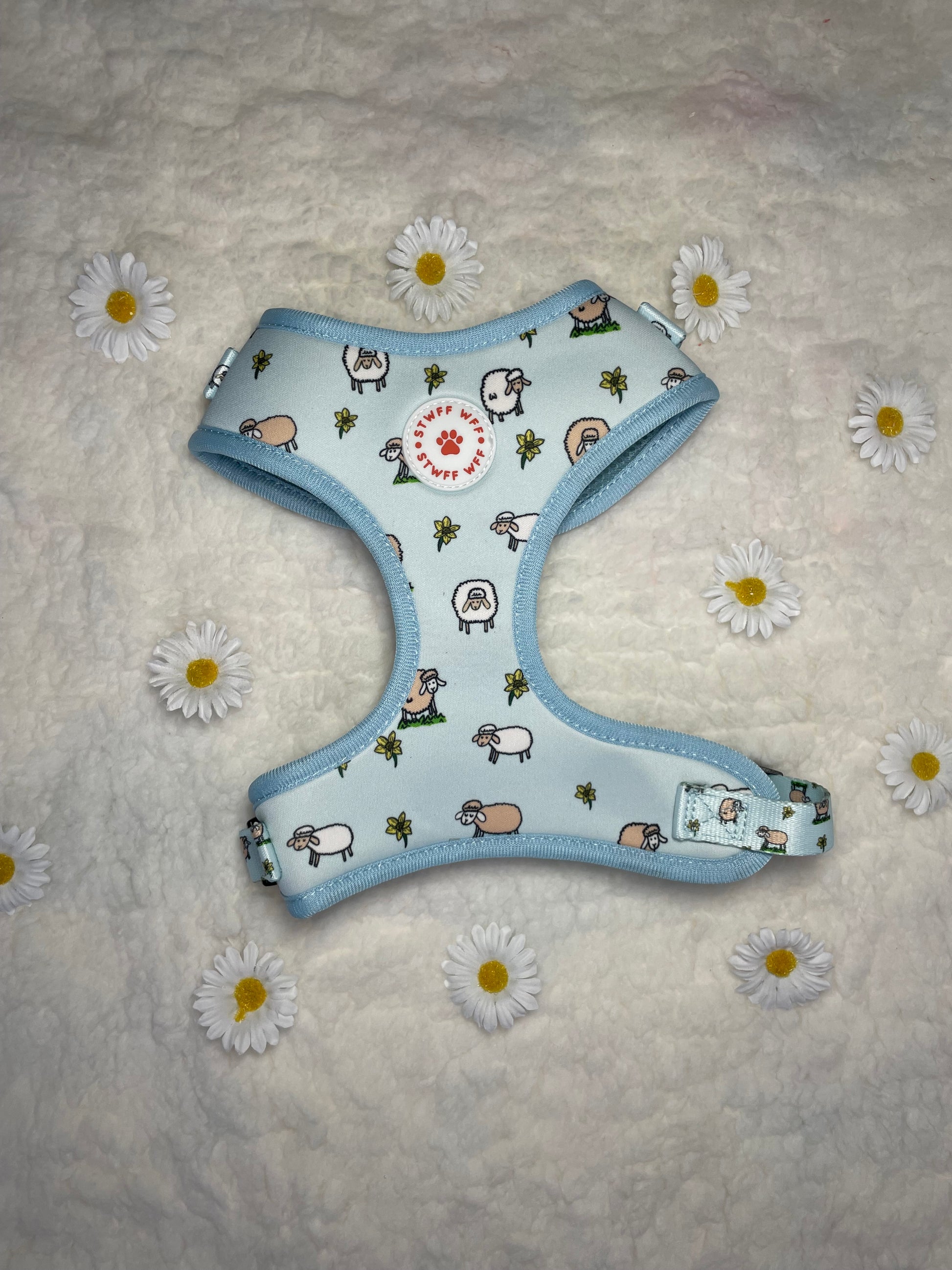 Set o 3 item sy'n cynnwys - Harnes, Coler ac tennyn hefo dyluniad hefo Defaid cymraeg ac cennin pedr ar cefndir glas golau.