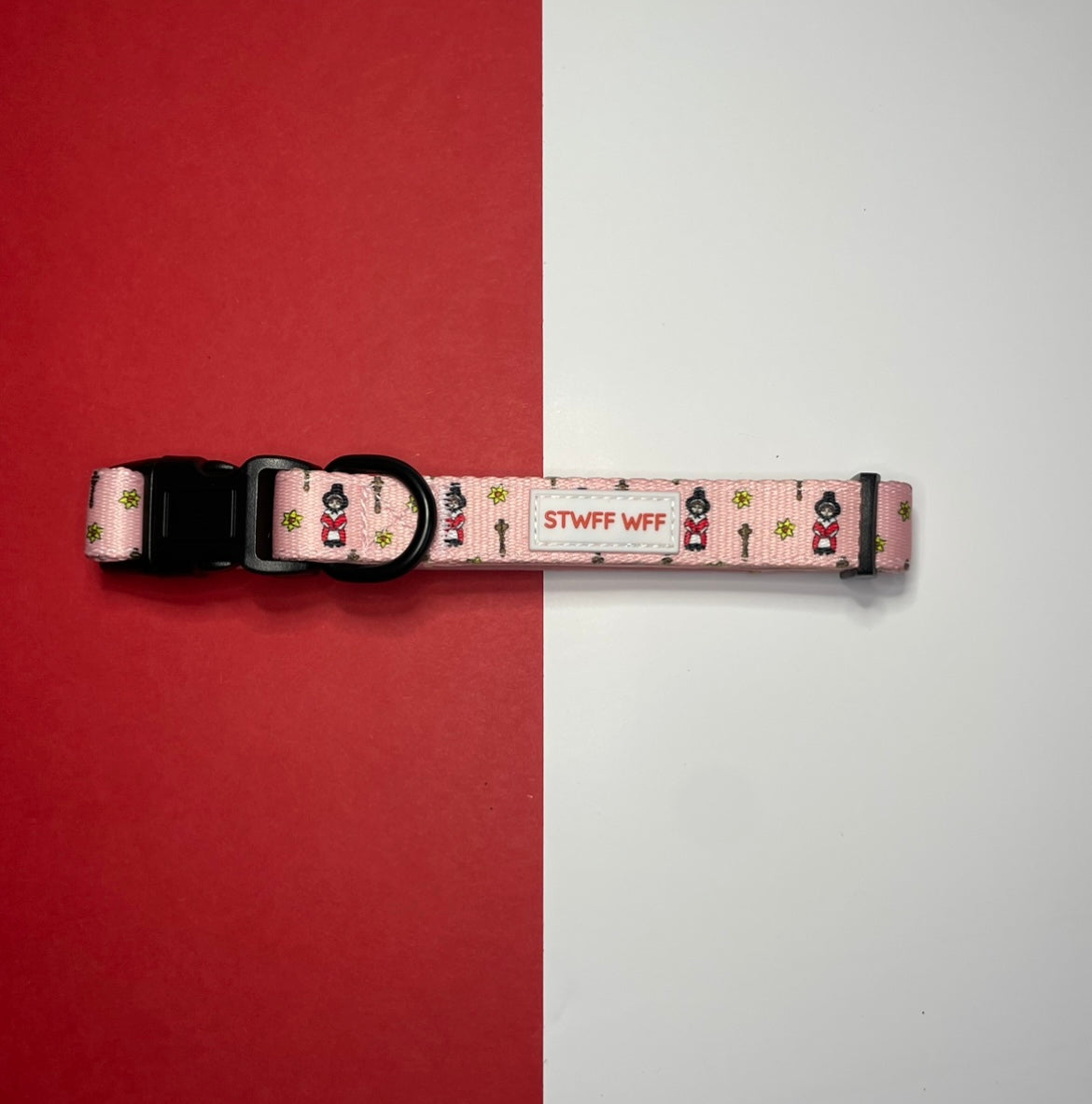 Collar with the welsh lady, love spoon and daffodils on a light pink background.