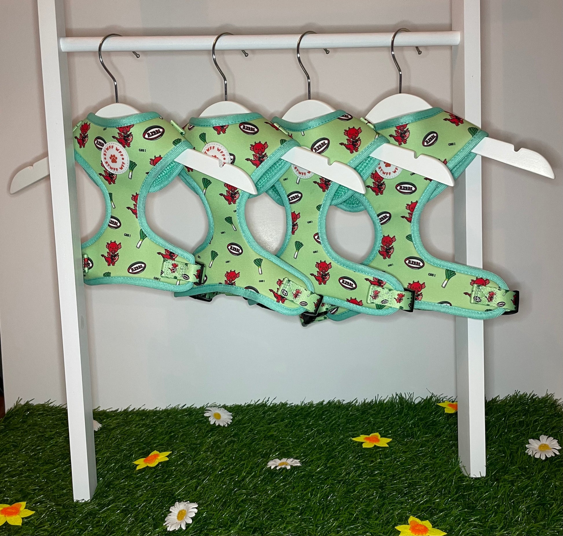 Harness with a red dragon, rugby ball and leeks on a light green background design.